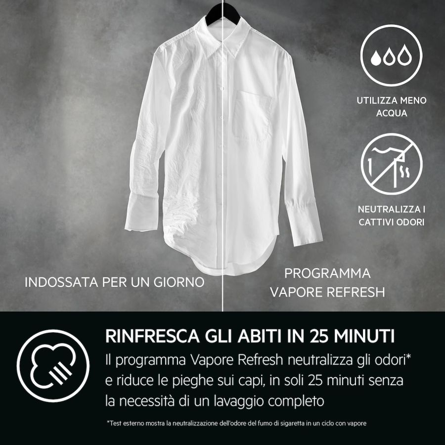 Il programma Vapore Refresh neutralizza gli odori* e riduce le pieghe sui capi, inclusi i delicati, in soli 25 minuti senza la necessità di un lavaggio completo.