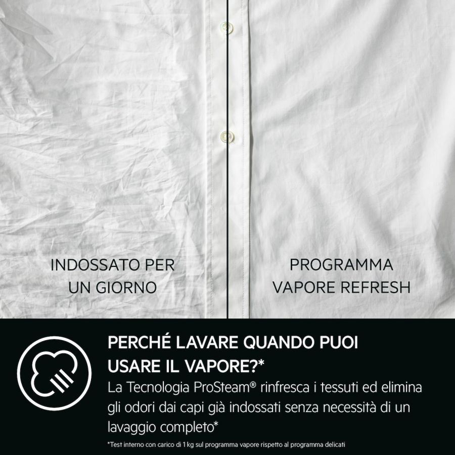 Lavatrici caricamento frontale AEG LR7FH94VY TRN956164Il vapore rinfresca rapidamente i tessuti ed elimina gli odori dai capi già indossati, consumando solo 2L d?acqua per ciclo. Aggiungendo invece l?opzione Vapore Finale al termine di un ciclo di lavaggio, puoi ridurre le pieghe e il tempo di stiratura.