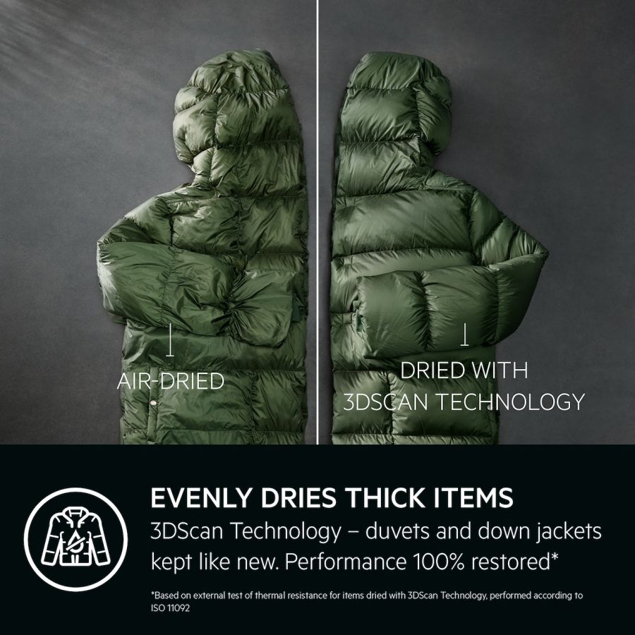 OGNI FIBRA È SCANSIONATA, PROTETTA E ASCIUGATA UNIFORMEMENTE La Tecnologia 3D Scan rileva l'umidità residua nei capi fino a 10cm di profondità, a differenza dei comuni sensori di umidità, che scansionano solamente la superficie dei capi. Garantisce un'asciugatura di precisione anche di giacche e piumini, che mantengono il loro aspetto e l?isolamento termico. TECNOLOGIA 3D SCAN. PIUMINI PERFETTAMENTE ASCIUGATI CON LA MASSIMA PRECISION. Asciugatrice con carica frontale - Libera installazione (FS) - Asciugatura a condensazione - Capacità 8 Kg - Classe energetica A+++ - Con antipiega - Con tasto partenza ritardata - Programmi speciali: Rapido 3 kg, Lenzuola XL, Cotoni Eco, Cotoni, Delicati, Piumini, Hygiene, MixDry, Outdoor, Seta, Sintetici, Lana - Con Pompa di calore - Con illuminazione cestello - Sistema filtrante: Easy Flow Tecnologia sostenibile: ÖkoPro -