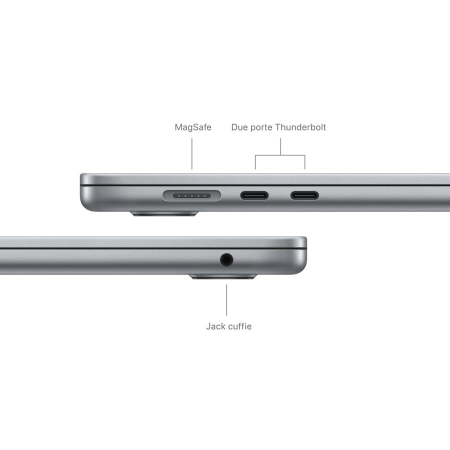 - LE CONNESSIONI GIUSTE ? MacBook Air ha due porte Thunderbolt, un jack per le cuffie, Wi-Fi 6E, Bluetooth 5.3 e una porta MagSafe per la ricarica. E puoi collegare fino a due monitor esterni (con il display del notebook chiuso).