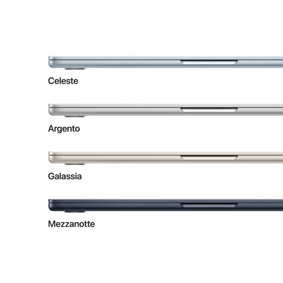 MacBook Air 13". Progettato per Apple Intelligence. Con il chip M4, MacBook Air 13" ti fa sfrecciare in scioltezza fra i tuoi impegni e le tue passioni. Ha Apple Intelligence, uno splendido display Liquid Retina e un design estremamente sottile e leggero. È fatto per durare a lungo, e con una batteria che dura fino a 18 ore è pronto a seguirti in tutto, dappertutto. CON I SUPERPOTERI DI M4 ? Il chip Apple M4 rende ancora più veloce e fluido tutto quello che fai: te ne accorgi quando lavori con più app insieme, fai montaggio video o ti immergi in giochi dalla grafica complessa. PROGETTATO PER APPLE INTELLIGENCE ? Apple Intelligence è il sistema di intelligenza personale che rende più facile scrivere, creare e fare tutto ciò che vuoi. E grazie a funzioni di privacy di ultima generazione, hai la certezza che nessuno potrà accedere ai tuoi dati, nemmeno Apple. FINO A 18 ORE DI BATTERIA ? MacBook Air ti dà performance incredibili anche quando non è collegato alla corrente. DESIGN ULTRAPORTATILE ? Leggerissimo e con uno spessore di poco più di un centimetro, MacBook Air si infila comodamente in borsa ed è pronto a uscire insieme a te. UN DISPLAY DA PAURA ? Il display Liquid Retina da 13,6" supporta un miliardo di colori. Foto e video sembrano saltar fuori dallo schermo grazie all?elevato contrasto e alla nitidezza dei dettagli. E anche il testo è ultradefinito. FATTI VEDERE E SENTIRE ALLA GRANDE ? Videocamera 12MP Center Stage, tre microfoni e quattro altoparlanti con audio spaziale: una gioia per gli occhi e per le orecchie. SI CONNETTE A TUTTO ? MacBook Air ha due porte Thunderbolt 4, una porta di ricarica MagSafe, un jack per cuffie, il Wi Fi 6E e il Bluetooth 5.3. E puoi collegare fino a due monitor esterni. MACOS METTE IL TURBO ALLE APP ? Tutte le app che usi di più, comprese Microsoft 365, Adobe Creative Cloud e Google Workspace, su macOS vanno a tutta velocità. SE AMI IL TUO IPHONE, AMERAI ANCHE IL MAC ? Il Mac funziona in perfetta sintonia con gli altri dispositivi Apple. Puoi fare copia e incolla dall?iPhone al Mac. E anche usare il Mac per inviare messaggi di testo o fare e ricevere chiamate FaceTime.