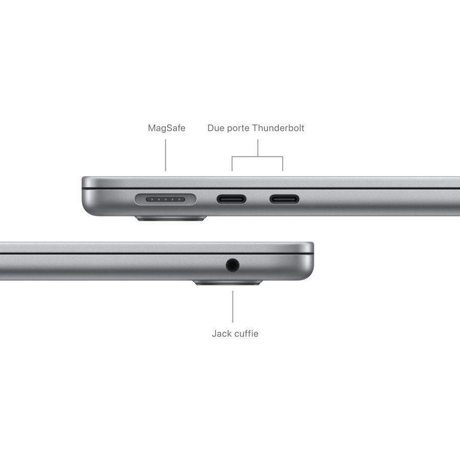 - LE CONNESSIONI GIUSTE ? MacBook Air ha due porte Thunderbolt, un jack per le cuffie, Wi-Fi 6E, Bluetooth 5.3 e una porta MagSafe per la ricarica. E puoi collegare fino a due monitor esterni (con il display del notebook chiuso)