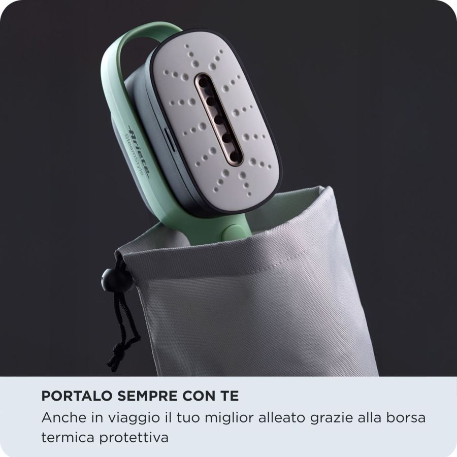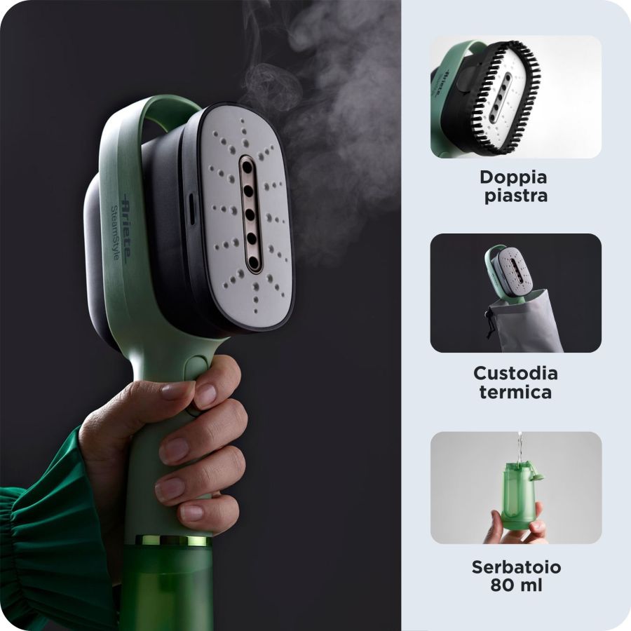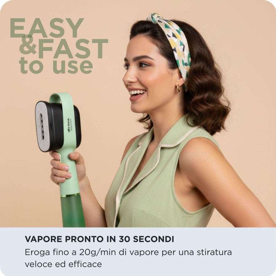a Vapore Ariete 4301/01 00S430101AR0-18Dimentica l'ingombro dell'asse da stiro e accogli la velocità e la praticità di Steam Style, il ferro da stiro verticale, l'alleato perfetto per in ogni situazione.Con una potenza di 1200W, Steam Style è pronto all'uso in soli 30 secondi, regalandoti un getto continuo di vapore fino a 20g/min per un'eliminazione delle pieghe facile e veloce. Che tu debba fare un ritocco dell'ultimo minuto prima di uscire, o eliminare le stropicciature create da un lungo viaggio, Steam Style è la soluzione pratica e rapida che stavi cercando, adatta a diversi tipi di tessuti.Grazie al suo design ultra-slim (12x6x30.5cm), si infila ovunque: è perfetto da riporre nel cassetto di casa o da portare con te nel tuo trolley da viaggio. E per adattarsi al tuo stile, Steam Style è disponibile negli eleganti colori Mint, Coral e Violet.Grazie al potente vapore Steam Style non è solo un ferro da stiro verticale. È un mini-igienizzatore! Usalo per dare una refreshata super naturale (senza uso di detergenti chimici) ai tessuti: cuscini, materassi o i tuoi peluche preferiti. I suoi accessori sono pensati anche per chi vive in movimento: include una pratica spazzola rimuovi pelucchi (removibile con un click, adatta ai tessuti più spessi) e una sacca resistente al calore per riporlo subito dopo l'uso, garantendo massima praticità sia a casa che in viaggio.Con un serbatoio da 80ml, funzione anti-goccia e autospegnimento, Steam Style garantisce efficienza, sicurezza e ti permette di scegliere il tuo look in totale libertà