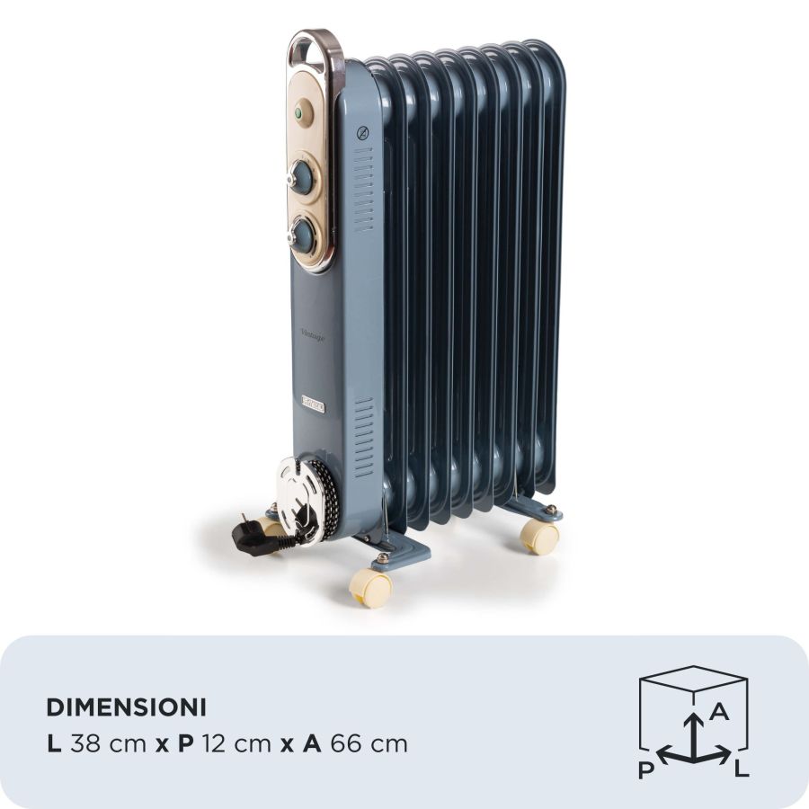 Radiatori Ariete Radiatore Ariete B825105AREG VINTAGE 9 elementi Blue e Cream 12BB0978307Il radiatore a olio Vintage di Ariete è pensato per portare un clima di benessere nella tua casa con lo stile unico e le linee anni '50 tipiche della linea Vintage di Ariete. Pratico e funzionale, gli elementi riscaldanti arrivano a temperatura in pochi istanti, regalandoti tutto il calore di cui hai bisogno. Il radiatore si trasporta facilmente in ogni stanza, grazie alla pratica maniglia e alle 4 ruote girevoli a 360°, accompagnandoti nei tuoi momenti di relax: riscalda la camera da letto, il bagno prima della doccia nelle giornate più fredde o qualsiasi altro ambiente della casa e, grazie ai 3 livelli di potenza, scegli tu la temperatura che preferisci. Un vero e proprio oggetto di design che arreda la tua casa con l'elegante stile Vintage Ariete.