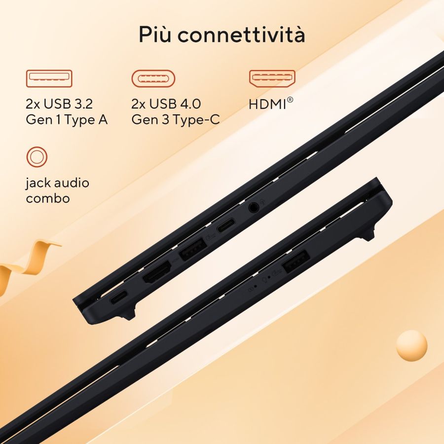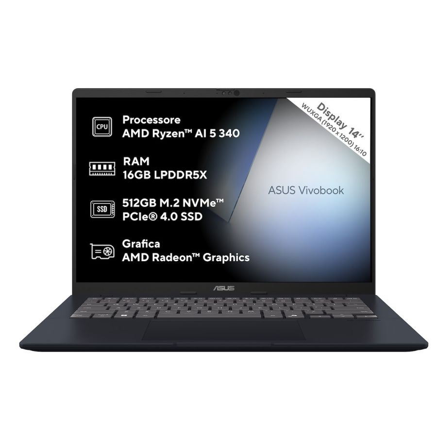 Notebook - Utilizzo Family-Home - Con AI (Intelligenza Artificiale) - Processore Ryzen AI 5 - AMD Ryzen? AI 5 340 Processor 2.0GHz ( 22MB Cache, up to 4.8GHz, 6 cores, 12 Threads) - 50 Tops - Velocità 2 GHz - Turbo 4,8 Ghz - RAM 16 Gb - DDR5 - SSD 512 GB - Scheda grafica AMD - AMD Radeon? Graphics - Monitor LED - 14 pollici - Con display antiriflesso - WUXGA (1920x1200) - Wireless 802.11 ax - Bluetooth 5.3 - Con HDMI - Con videocamera incorporata - Sistema operativo Windows 11 - Batteria 3 celle - ASUS Vivobook 14