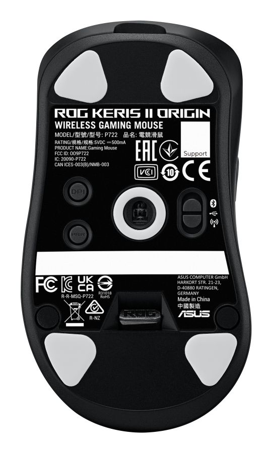 Mouse Gaming Asus P722 ROG KERIS II ORIGIN/BLK 90MP04A0-BMUA00 90MP04A0-BMUA00ROG Keris II Origin BLK. Fattore di forma: Mano destra. Tecnologia di rilevamento del movimento: Ottico, Interfaccia dispositivo: RF Wireless + Bluetooth + USB Type-A, Risoluzione movimento: 42000 DPI, Tipo di pulsanti: Tasti premuti, Numero di tasti: 6, Tipo di scorimmento: Rotella. colore d'illuminazione: Multi. Alimentazione: Batterie/Cavo. Colore del prodotto: Nero