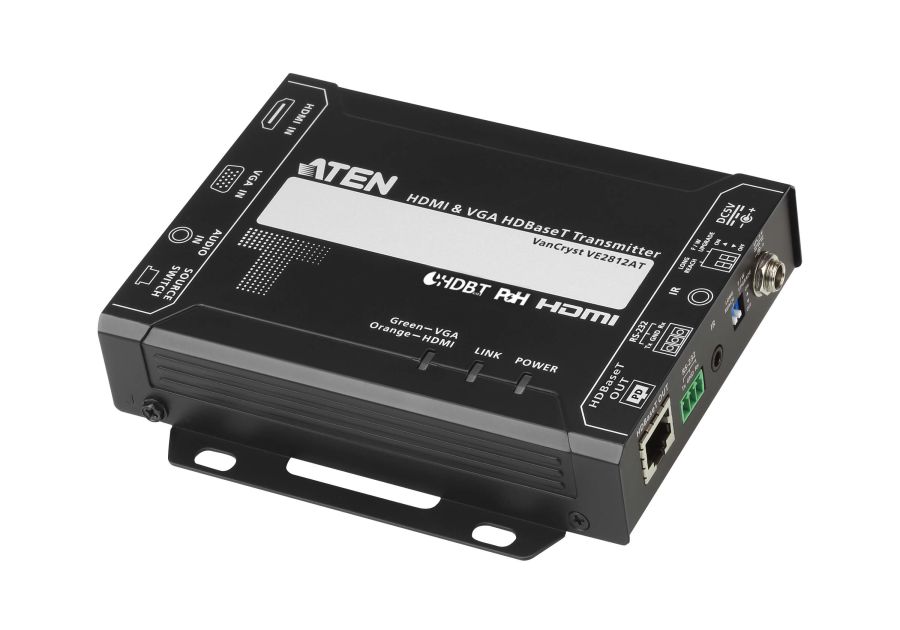 EXTENDER VIDEO ATEN 4K HDMI VGA HDBASET TRANSMITTER VE2812AT-AT-G VE2812AT-AT-GATEN VE2812AT è un trasmettitore per l'invio di segnali VGA (con audio) e HDMI fino a 100 m con un singolo cavo Cat 5e/6/6a o ATEN 2L-2910 Cat 6. Grazie alla funzione PoH (Power over HDBaseT) integrata, il VE2812AT riceve l'alimentazione dalla porta di uscita HDBaseT sul dispositivo collegato. Elimina la necessità di un adattatore di alimentazione e riduce la distribuzione dei cavi della corrente dietro la parete. Il VE2812AT garantisce una trasmissione affidabile dei segnali HDMI oltre a supportare 3D, Deep Color, e i formati audio HD senza perdita integrati. Garantisce inoltre una trasmissione VGA (con audio) a una distanza massima di 100 m. Supporta inoltre la Modalità lunga distanza fino a 150 m mediante un singolo cavo Cat 5e/6 con risoluzioni fino a 1080p.