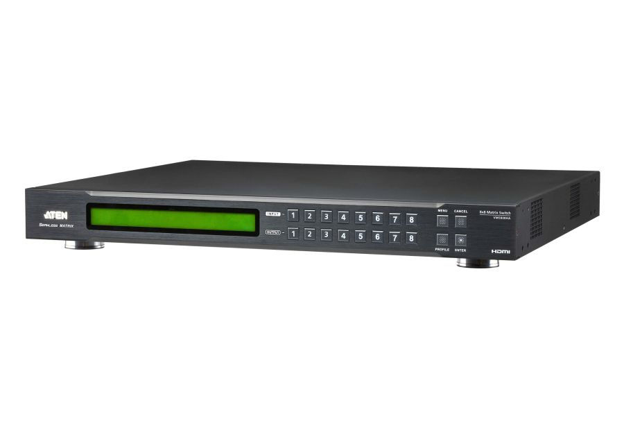 AV Specials ATEN 8 X HDMI MATRIX SWITCH VM5808HA-AT-G VM5808HA-AT-G8 x 8 HDMI Matrix Switch with. Tipo di prodotto: Commutatore a matrice AV, Velocità di trasferimento dati: 6,75 Gbit/s, Pixel clock massimo: 225 MHz. Colore struttura: Nero, Materiale della scocca: Metallo, Capacità di rack: 1U. Consumo energetico (max): 58,1 W, Consumi: 56,6 W, Tensione di ingresso AC: 100 - 240 V. Paese di origine: Taiwan, Peso del cartone principale: 7,04 kg, Lunghezza del cartone principale: 575 mm. Larghezza: 378,2 mm, Profondità: 432,4 mm, Altezza: 44 mm