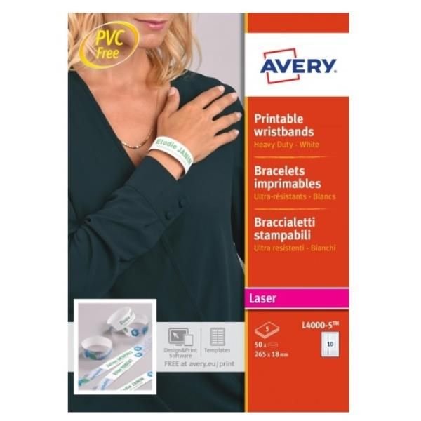 Braccialetti identificativi. Avery BRACCIALETTI IDENTIFICATIVI STAMPABILI 265X18 L4000-5 L4000-5BRACCIALETTI IDENTIFICATIVI STAMPABILI