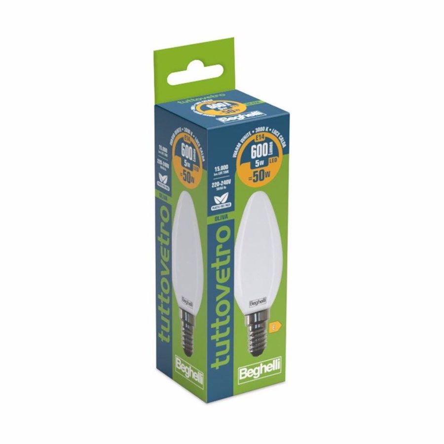 BEGHELLI LAMP. LED OLIVA 5W E14 3000KTUTTOVETRO OLIVA OPALE LUCE CALDA 600 LUMEN