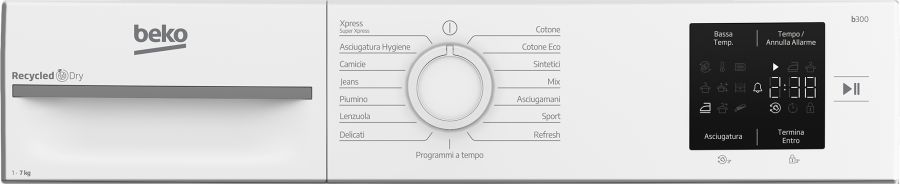 Programmi di asciugatura Cotone, Cotton eco, Delicati/Seta, Piumino/piumone, Hygienic drying, Jeans/denim, Mix, Rapido, Refresh, Shirts, Silent, Sport, Sintetico, Programmato, Asciugamano, Lana
