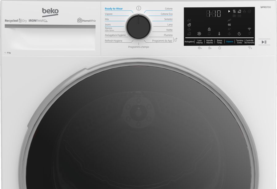 Programmi di asciugatura Cotone, Cotton eco, Delicati/Seta, Piumino/piumone, Hygienic drying, Jeans/denim, Biancheria intima, Mix, Rapido, Refresh, Shirts, Silent, Sport, Vapore, Sintetico, Programmato, Asciugamano, Lana