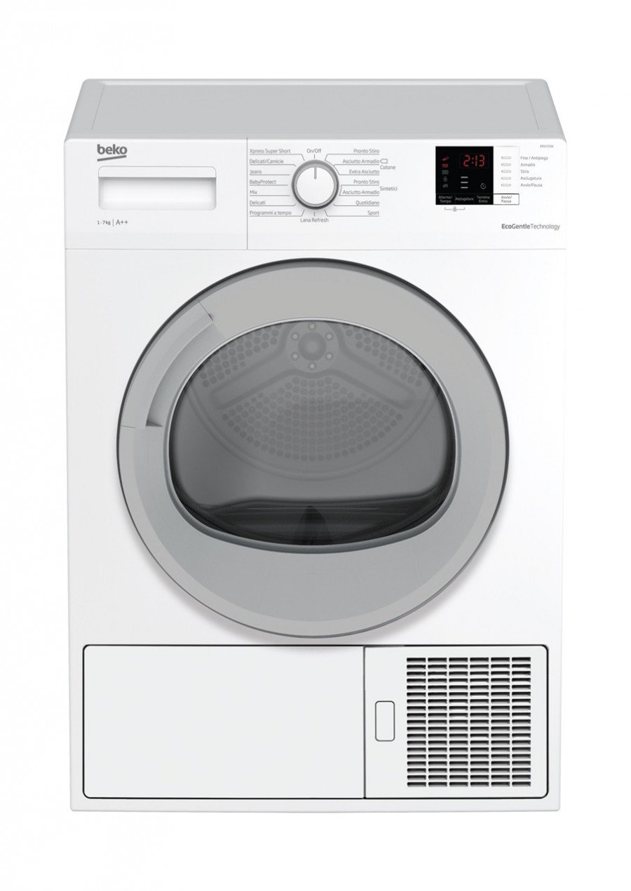 Asciugatrici Beko DRX722W DRX722WDRX722W. Posizionamento dell'apparecchio: Libera installazione, Tipo di carica: Caricamento frontale, Sistema di asciugatura: Pompa di calore. Capacità cestello: 7 kg, Classe di efficienza della condensazione: B, Programmi di asciugatura: Mix, Rapido, Delicati/Seta, Camicia/maglietta. Partenza ritardata: 24 h. Classe efficienza energetica: A++, Consumo energetico annuo: 212 kWh, Fonte di calore: Elettrico. Profondità: 540 mm, Larghezza: 595 mm, Altezza: 846 mm