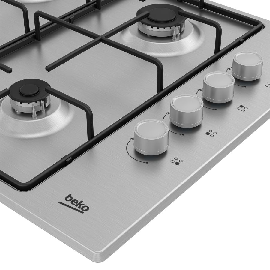 a Gas Beko HIGG641C3S PIANO COT 60CM 4F LATER INOX GT0910108006HIGG 641C3 SX: Piano a Gas, 4 Bruciatori, 60 cm. Colore del prodotto: Acciaio inox, Posizionamento dell'apparecchio: Da incasso, Dimensione della larghezza del piano cottura: 60 cm. Tipo di controllo: Manopola, Posizione di controllo: In alto a destra. Potenza aggregata (elettrica): 1 W, Potenza aggregata (gas): 7900 W, Tensione di ingresso AC: 220 - 240 V. Larghezza: 61 mm, Profondità: 510 mm, Altezza: 44 mm. Larghezza imballo: 680 mm, Profondità imballo: 610 mm, Altezza imballo: 180 mm
