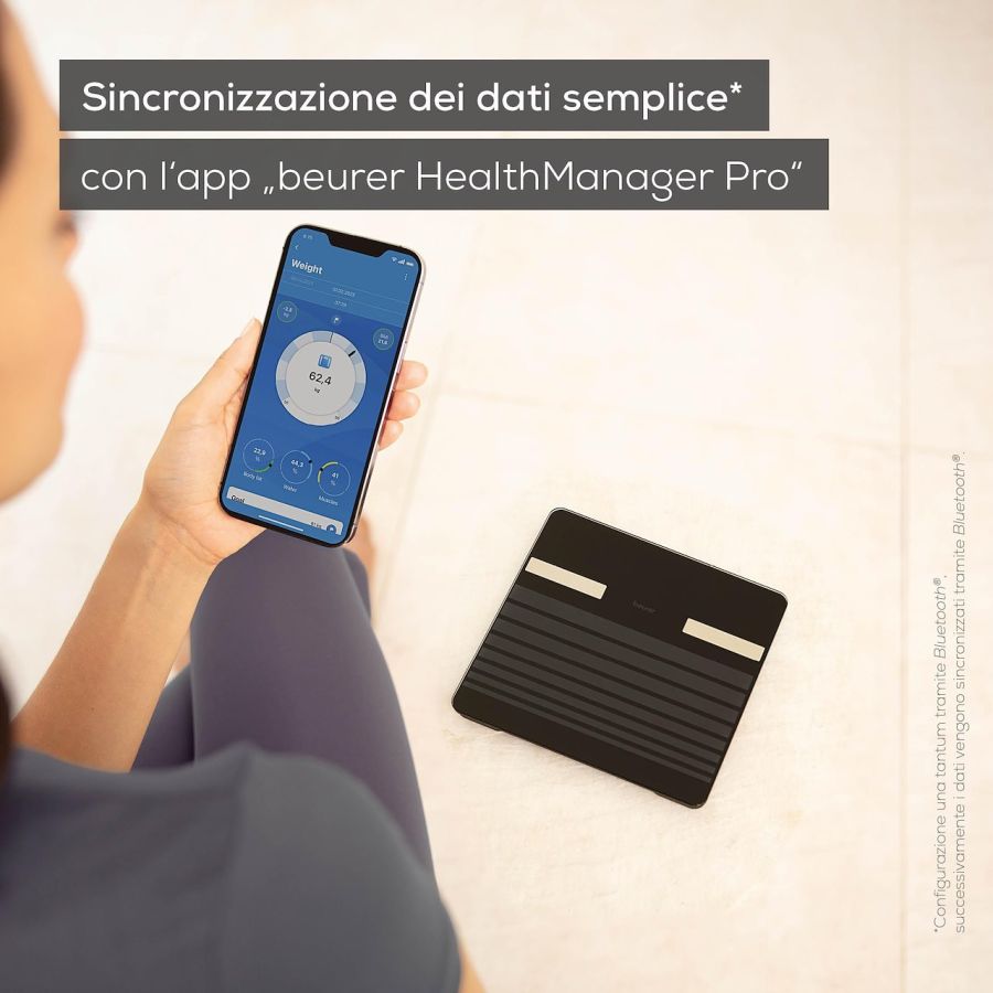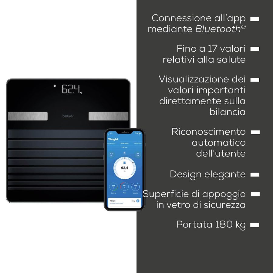Altre funzioni - 17 valori relativi alla salute sempre sotto controllo - Visualizzazione di importanti valori relativi alla salute direttamente sulla bilancia (peso, IMC, massa grassa, percentuale di acqua, massa muscolo-scheletrica) - Altri valori visibili sull'app Beurer HealthManager Pro: Body Profile, Massa muscolare totale (incl. muscoli degli organi), Peso ideale, Indicatore calorico (AMR), Indicatore calorico (AMR), Massa magra, Età metabolica, Proteine, Massa magra morbida, Grasso sottocutaneo, Grasso viscerale. - Elegante display LED Magic: il display compare solo al momento della misurazione - Portata elevata di max. 180 kg - Pratica accensione automatica: basta salire e si accende - Pratica funzione di spegnimento automatico - Indicatore di sovraccarico in caso di superamento della portata massima - Piena funzionalità solo con l'app gratuita "beurer HealthManager Pro"