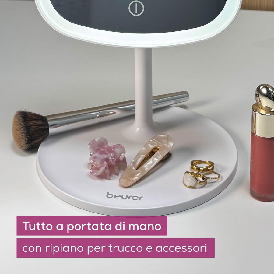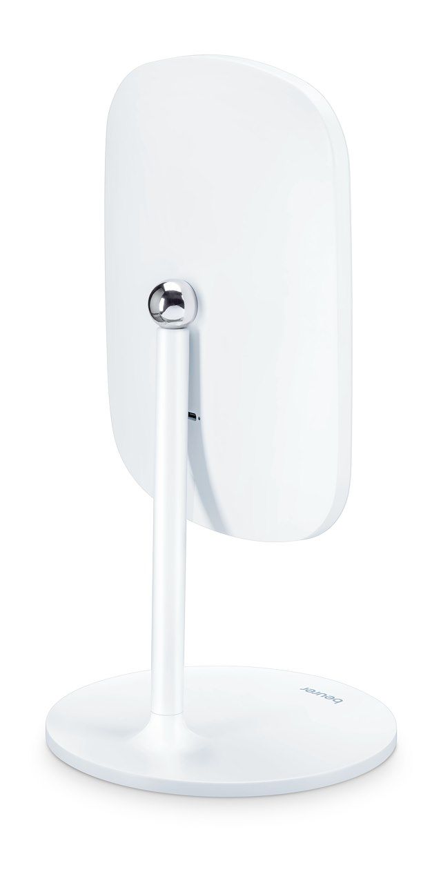 Lo specchio BS 47 di Beurer, oltre ad essere una magnifica idea regalo, si adatta perfettamente sia al vostro bagno che alla vostra camera da letto. BS 47 di Beurer offre tre diverse opzioni di luce con intensità regolabile: calda, fredda e naturale, ed è quindi l'ideale per sessioni di skincare e make up. Grazie al pratico supporto magnetico è possibile modificare la posizione dello specchio, ruotandolo di 360° per la massima flessibilità, o rimuoverlo trasformandolo in uno specchio portatile. Inoltre è facile da usare grazie al sensore touch integrato sulla superficie dello specchio. La base inoltre è un pratico porta oggetti dove riporre trucchi o gioielli. Dopo 15 minuti, la luce si spegne automaticamente per proteggere la batteria e garantire il tempo di funzionamento più lungo possibile. La superficie dello specchio inoltre è ruotabile in tutte le direzioni grazie a un giunto sferico.