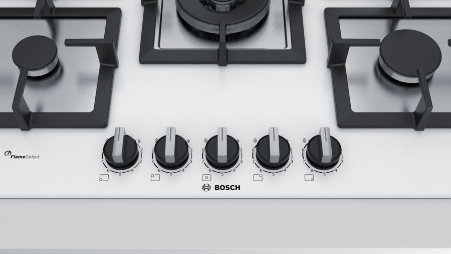 a Gas Bosch Piano cottura gas Bosch SERIE 6 Ppq7A2B20 Flameselect Bianco 29BB0666126I piani cottura in vetro temperato con FlameSelect: garantiscono design esclusivo, facilità di pulizia e risultati di cottura perfetti grazie a 9 livelli di potenza.