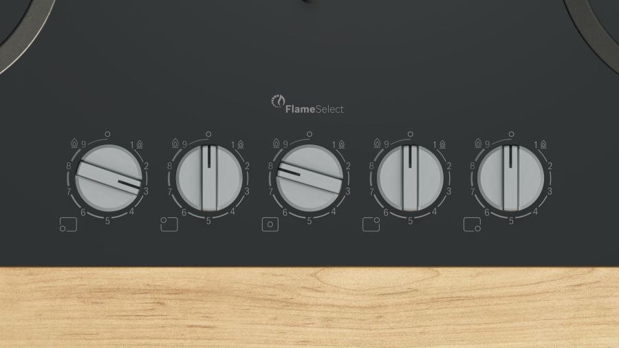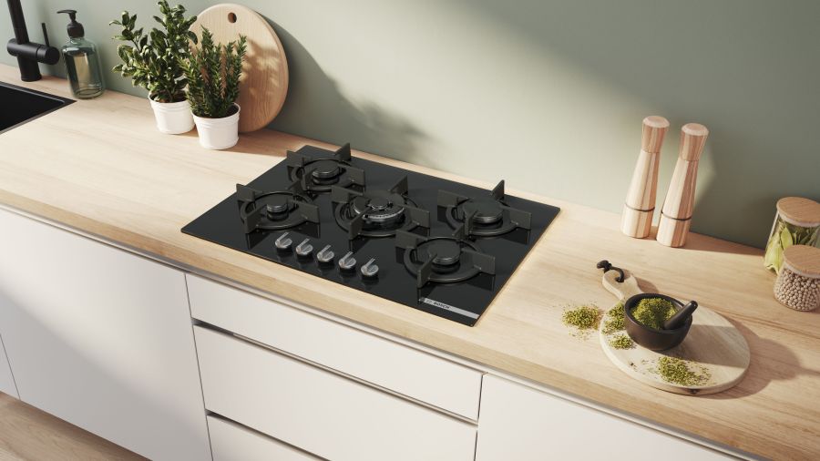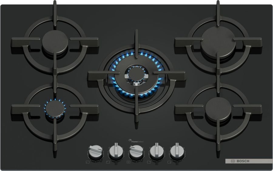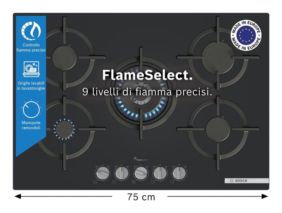 a Gas Bosch PPQ7A6I10 Piano GAS VETRO 5F 75CM NERO PPQ7A6I10Piano cottura a gas con controllo preciso della fiamma Flame Select e facile pulizia grazie alle manopole magnetiche removibili e alle griglie in ghisa lavabili in lavastoviglie.