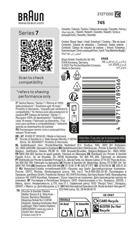 Lamina Braun 74S 74S-17Series 7 74 S. Tipo di prodotto: Testina per rasatura, Numero di testine rasatura: 1 testina/e, Colore del prodotto: Nero, Acciaio inox