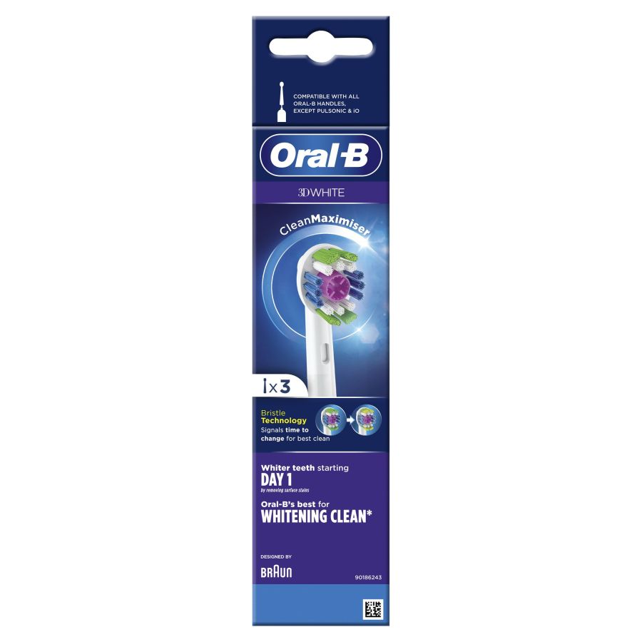 Spazzolini Braun Accessorio spazzolino elettrico EB-183 3D White EB1833DWHITETra le migliori testine di ricambio Oral-B, il modello 3D White con l?esclusiva coppetta lucidante sbianca i denti sin dal primo giorno rimuovendo le macchie superficiali. Le testine di ricambio migliorate 3D White di Oral-B sono sviluppate con la tecnologia CleanMaximiser, che trasforma le setole da verdi a gialle per ottenere prestazioni ottimali e una pulizia migliore. Le setole esclusive spazzolano via la placca per ottenere una pulizia più avanzata rispetto a uno spazzolino manuale tradizionale. Compatibile con tutti gli spazzolini Oral-B, tranne Pulsonic e iO.