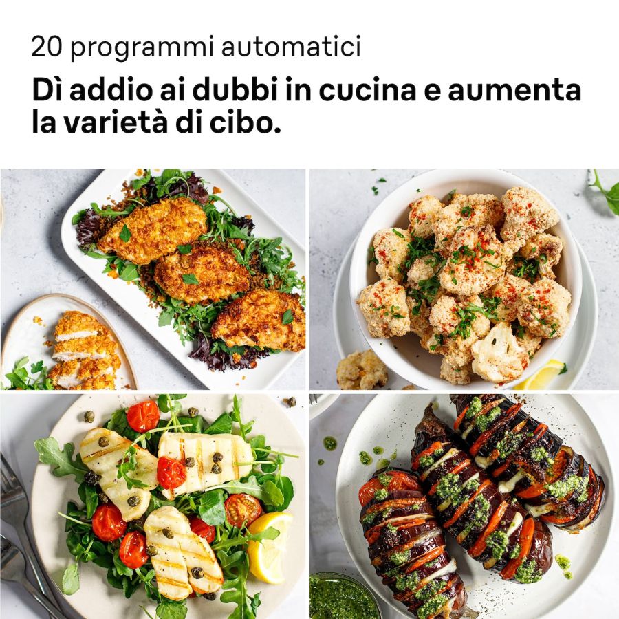 Altre funzioni Tecnologia RealOven 3+1: Friggete, cuocete e grigliate - ottenete risultati più croccanti in tempi più brevi* grazie a due elementi riscaldanti: uno sopra il cibo e uno sotto. *vs Braun MultiFry senza RealOven Tec. 20 programmi di cottura automatici: versatilità illimitata, grazie ai 20 programmi di cottura automatici: patatine fritte surgelate, patate al forno, verdure, pollo, pesce, carne, torte, e molto altro con la funzione di cottura che preferisci: al forno, friggitrice ad aria o grill.