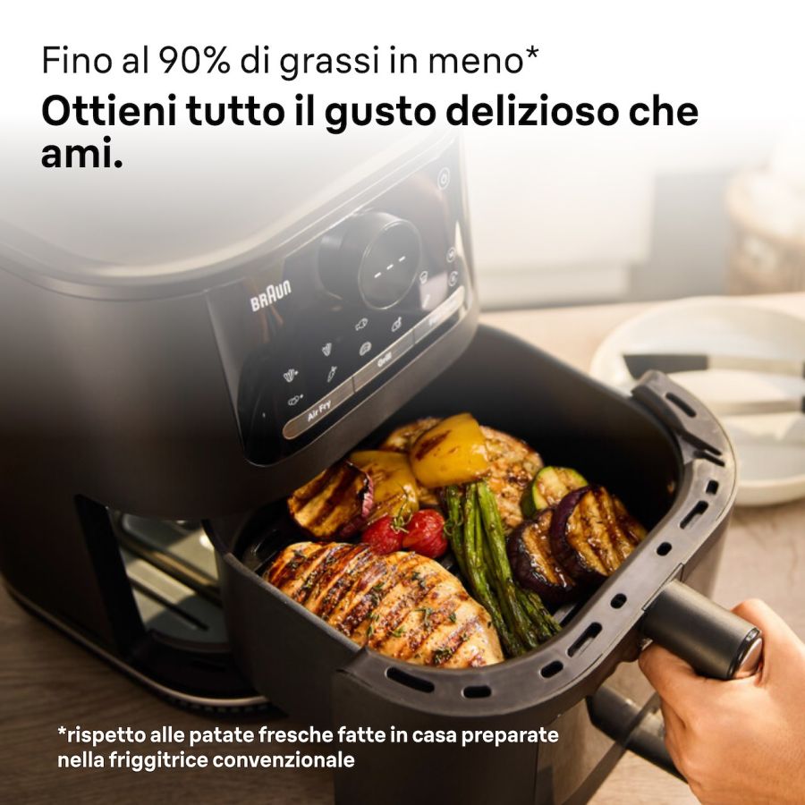La nuova Friggitrice ad Aria MultiFry 5. Capacità 6 lt, 1,4kg di patatine fritte surgelate, potenza 2000W, 2 elementi riscaldanti (uno sopra e uno sotto), display digitale a LED con 3 pulsanti funzione, termostato elettronico (80-220°C), 20 programmi di cottura. Funzioni Airfry, forno e grill. Piastra grill pressofusa. Finestra trasparente. Cestello in ceramica anti aderente PFAS FREE, per cuocere i tuoi piatti preferiti in modo salutare. Progettato per durare: 5 ANNI DI GARANZIA* Braun è da sempre sinonimo di affidabilità tedesca, con prodotti di qualità, testati con oltre 100 test e progettati per durare nel tempo.