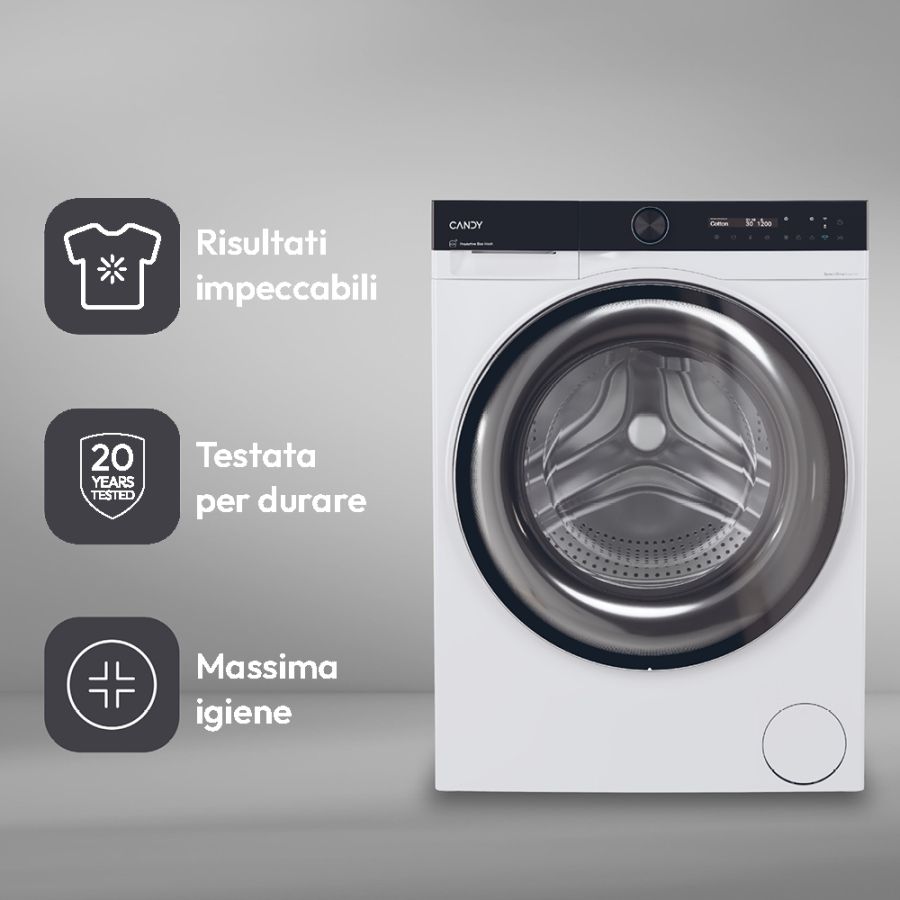 Nata per essere pronta a qualsiasi sfida di lavaggio, la lavatrice Candy ProWash 700 lava rapidamente i tuoi indumenti con il minimo consumo di energia e acqua, grazie alla funzione ProActive EcoWash, in un cestello XL sempre pulito. Estremamente silenziosa e intuitiva grazie al display LCD. ProWash 700 insieme all'app hOn, è progettata per trasformare il tuo bucato nell'esperienza più piacevole di sempre.