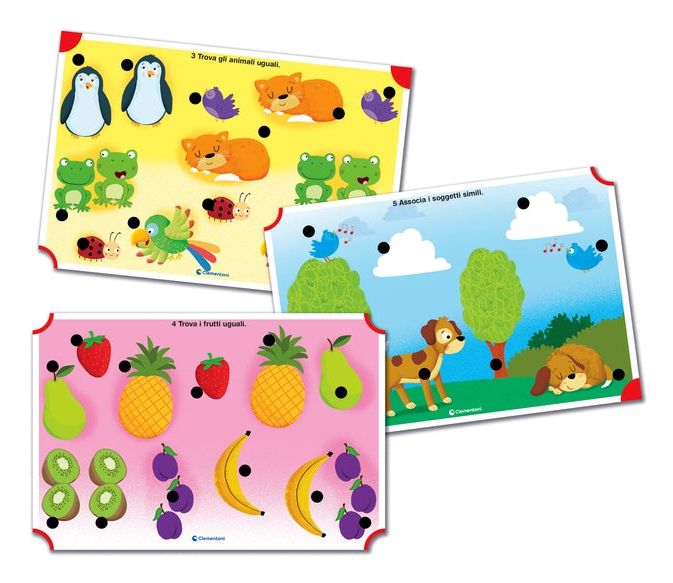 Le 16 schede educative con 32 attività propongono un programma di domande a difficoltà crescente che tocca tutti i temi tipici dell'età prescolare.