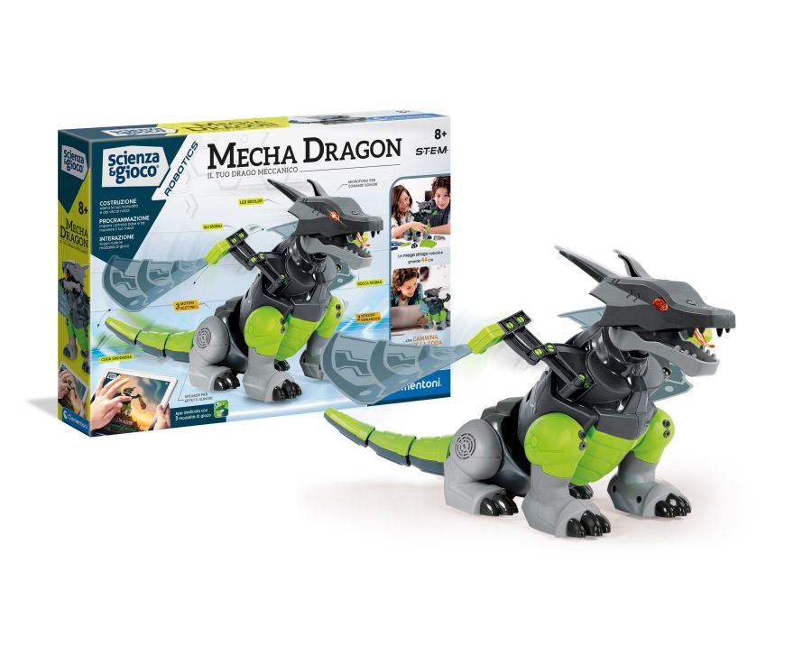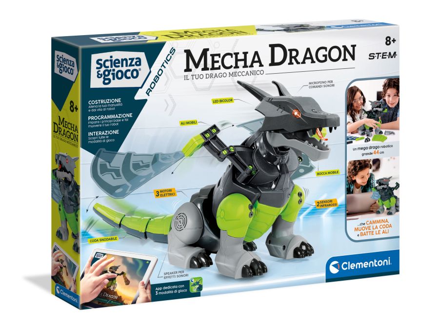 Giocattolo. Clementoni MECHA DRAGON ROBOT 19170 19170AUn kit per realizzare un fantastico Drago Meccanico capace di interagire con il bambino e con l?ambiente circostante grazie ai suoi 3 motori e ai multipli sensori, per vivere avventure infinite!Il Drago può essere controllato tramite un?app che comunica con segnali ad alta frequenza o tramite i 4 sensori ad infrarossi. Reagisce ai battiti della mano!Grazie ai 2 motori e al servo motore muove le ali e la bocca, la ruota motrice e lo snodo presente a metà del corpo che gli permetteranno di girare e inseguire la sua preda come se fosse vivo.Un robot unico con oltre 12 modalità di gioco, per avvicinarsi alla robotica in modo facile e divertente e sperimentare i principi dello STEM (Science, Technology, Engineering and Mathematics).Il Mecha Dragon è perfetto per sviluppare manualità, logica, orientamento spaziale e fantasia grazie anche alla grande interattività del gioco e all'esperienza unica del costruirlo.