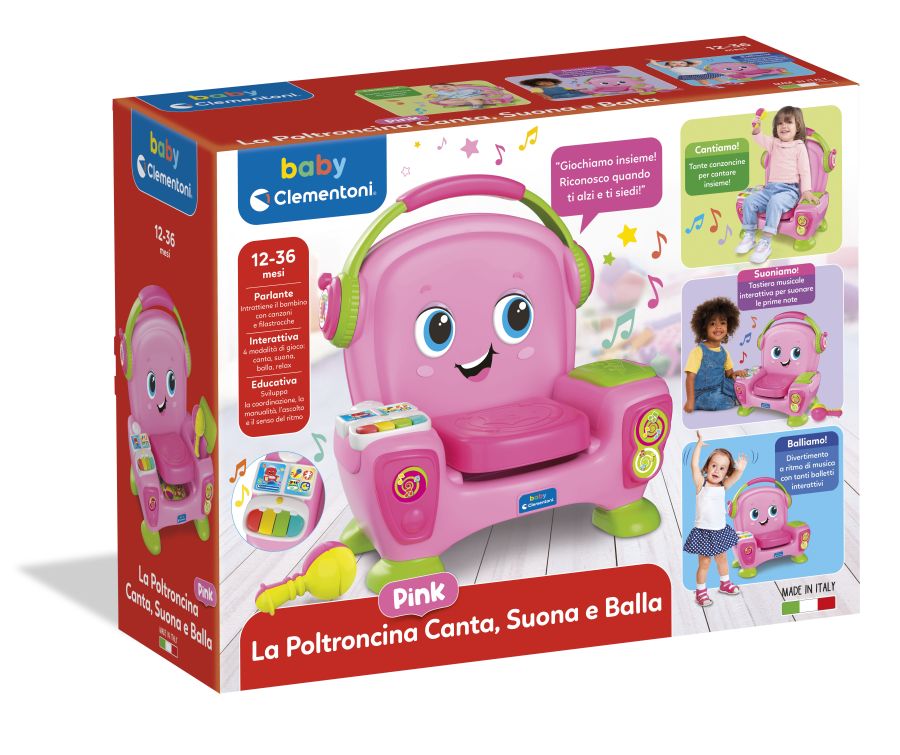 Giocattolo. Clementoni Poltroncina Suona Canta Girl Gioco prima infanzia Clementoni 17755 BABY Poltronc 17755AUna simpatica poltroncina multiattività e interattiva a tema musica, per far divertire i più piccoli a tutto ritmo! Per giocare, riposare, suonare e cantare, imparando le parole, numeri e colori. Ricca di strumenti musicali è dotata di una maraca, di una bacchetta per suonare il tamburo, una pianola e di una mini consolle con pulsanti touch e uno schermo luminoso. Lo speciale sensore della seduta riconosce quando il bambino si siede e propone musiche coinvolgenti e balletti interattivi, invitandolo a giocare in movimento. La Poltroncina Suona Canta e Balla ha tantissime funzioni per interagire con suoni, musiche, canzoni e parole, ed è ricca di attività meccaniche per giocare, suonare e sviluppare la manualità. La funzione "Balla" propone canzoncine interattive, come il "ballo della poltroncina", che invita il bambino ad alzarsi, ballare intorno alla sedia e sedersi prima che finisca il conto alla rovescia. La funzione "Suona" guida il bambino nell'utilizzo della pianola usando i colori dei tasti, per un primo approccio con la musica. Se si gioca con la funzione "Canta" il bambino è invitato a cantare insieme alla poltroncina una semplice canzone che stimola la lallazione. E con la funzione Relax tante coccole e dolci melodie.