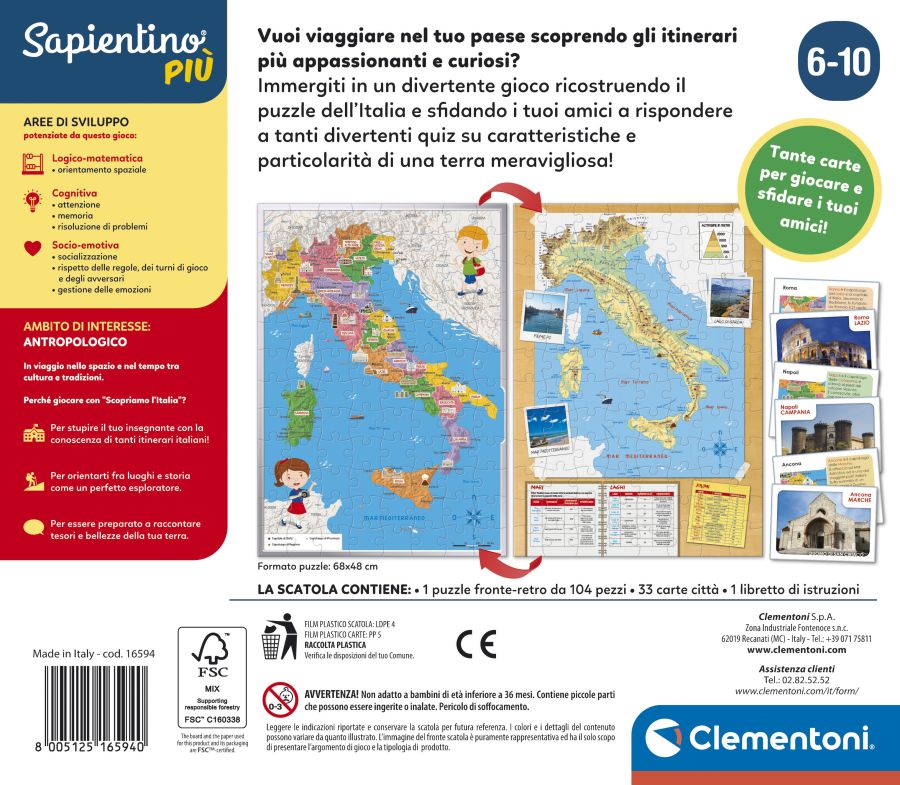 Puzzle. Clementoni Scopriamo l\'Italia Smart Puzzle Gioco educativo Clementoni 16594 SAPIENTINO Sco 16594Vuoi viaggiare nel tuo paese scoprendo gli itinerari più appassionanti e curiosi? Immergiti in un divertente gioco ricostruendo il puzzle dell?Italia e sfidando i tuoi amici a rispondere a tanti divertenti quiz su caratteristiche e particolarità di una terra meravigliosa!