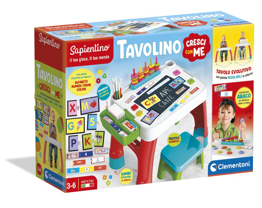 Gioco da tavolo. Clementoni Tavolino Cresci con me 16745 16745Un tavolo evolutivo ricco di attività educative progressive tipiche dell'età prescolare. Nel kit sono inclusi anche uno sgabello, 4 tacchetti per regolare l'altezza delle gambe, accessori in plastica per riporre il materiale di gioco, lettere in plastica ed un abaco con 25 forme colorate. Le attività sono sviluppate per adattarsi alle fasi di crescita del bambino: dalla lavagnetta con gessetti per attività guidate di scrittura, all'abaco per attività di classificazione e coding. Un kit completo per sviluppare la manualità e le capacità di associazione, e avvicinare i bambini al mondo della scrittura e dei numeri. La struttura solida e resistente, made in Italy, assicura un utilizzo duraturo e che evolve con il tempo.