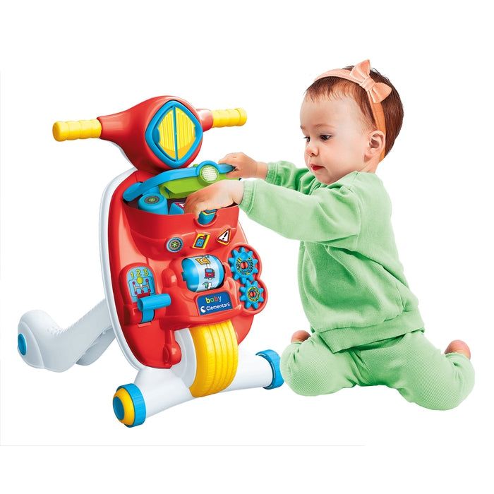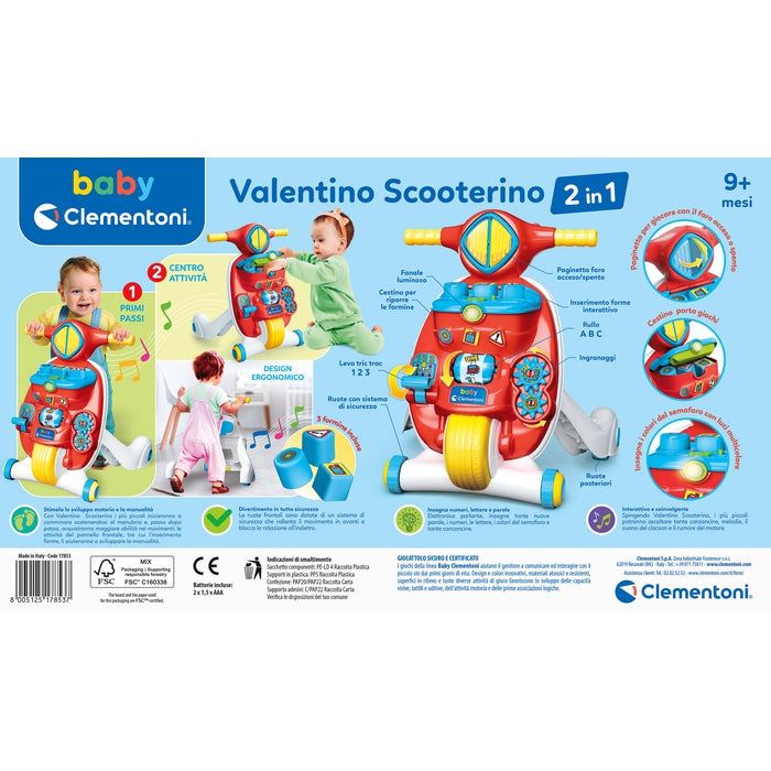 Giocattolo. Clementoni VALENTINO SCOOTERINO PRIMI PASSI 2 IN 1 2IN1 17853 17853Scooter 2in1: Un originale Primi Passi, ma anche un Centro Attività Meccanico ed Elettronico per imparare lettere e numeri e tanti altri contenuti educativi, sviluppando coordinazione e manualità. Con una struttura resistente e sicura Valentino Scooterino favorisce lo sviluppo della motricità, la cooordinazione e la percezione dello spazio, aiutando i più piccoli a muovere i primi passi. Il pannello frontale è ricco di attività: un inserimento forme interattivo, un fanalino luminoso, pulsante attività, paginette, rulli e ingranaggi. Il design iconico dello scooter Baby Clementoni rivisitato in una versione moderna ed accattivante.