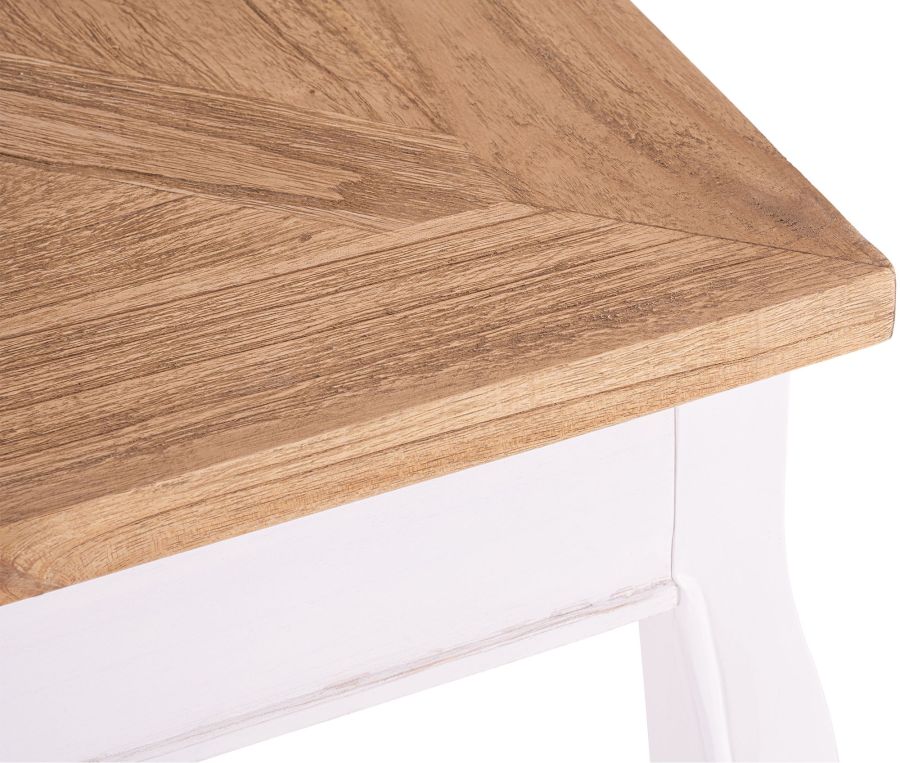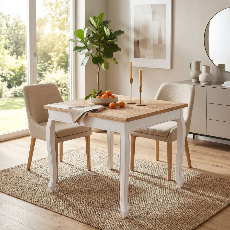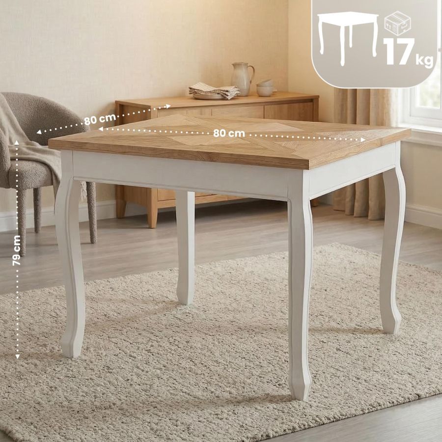 La solida base a quattro gambe con linee elegantemente curve garantisce stabilita e aggiunge un tocco decorativo. La finitura verniciata effetto anticato valorizza il carattere nostalgico del tavolo. Con un'altezza di 79 cm, il modello offre una seduta confortevole. I piedini salvapavimento integrati aiutano a prevenire segni e graffi sul pavimento. Una scelta ideale per chi ama lo stile country e desidera materiali naturali e una lavorazione curata.