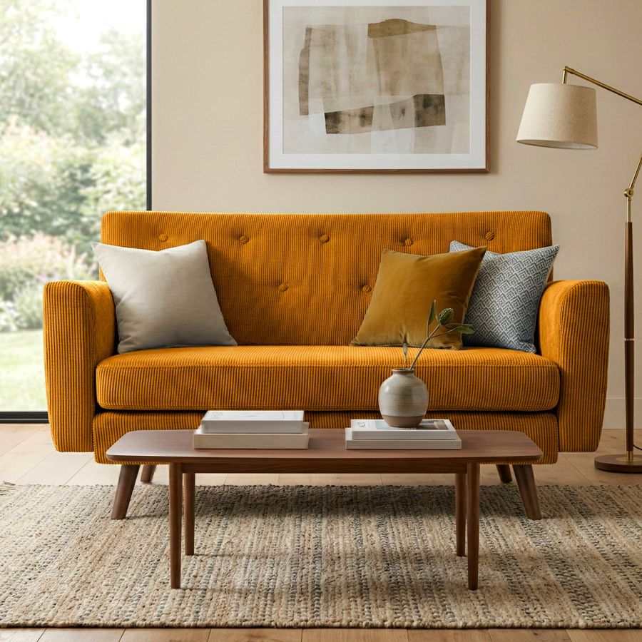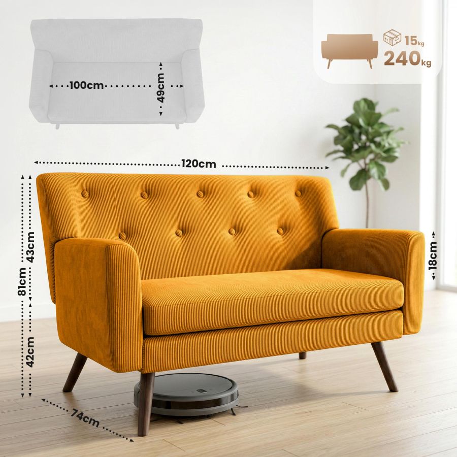 Questo divano 2 posti convince con un rivestimento resistente in velluto a coste, disponibile in colori di tendenza, e con solide gambe in legno di caucci. Lo schienale, insieme alla spessa imbottitura, aumenta sensibilmente il comfort di seduta (schiuma 25 kg/m3).