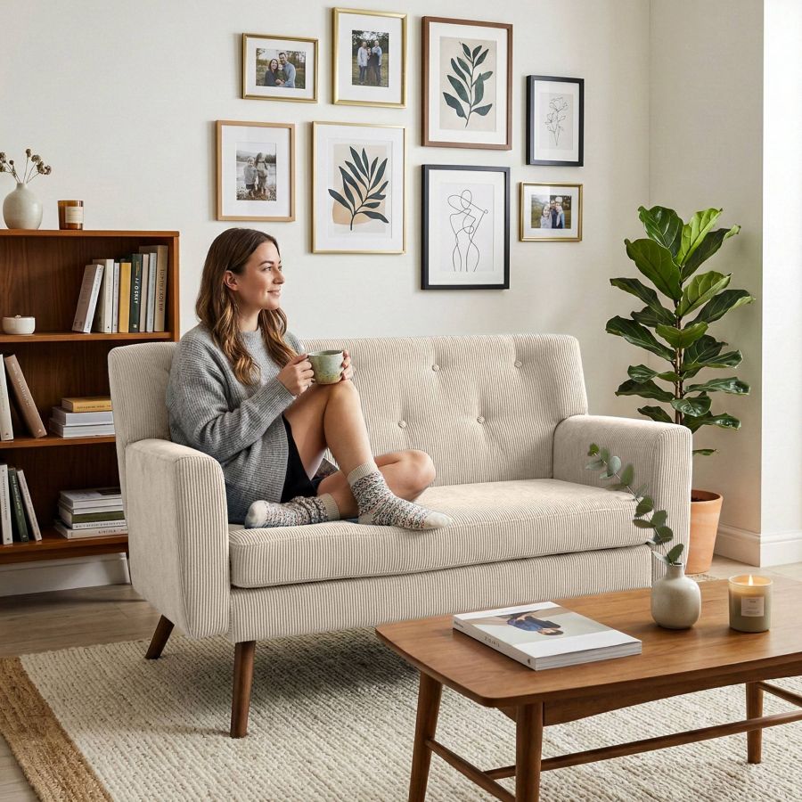 Il divano Kioni unisce eleganza e comfort con uno stile curato. Il design compatto e la seduta larga 100 cm offrono spazio per due persone, anche in ambienti piccoli.