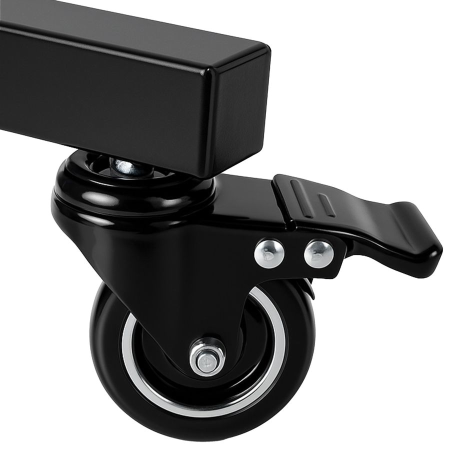 Nonostante il design slanciato, questo stand in metallo robusto e resistente, con una capacit di carico fino a 80 kg. Dotato di ruote, pu essere spostato facilmente e le ruote in gomma con freni di bloccaggio garantiscono una stabilit sicura senza danneggiare i pavimenti.