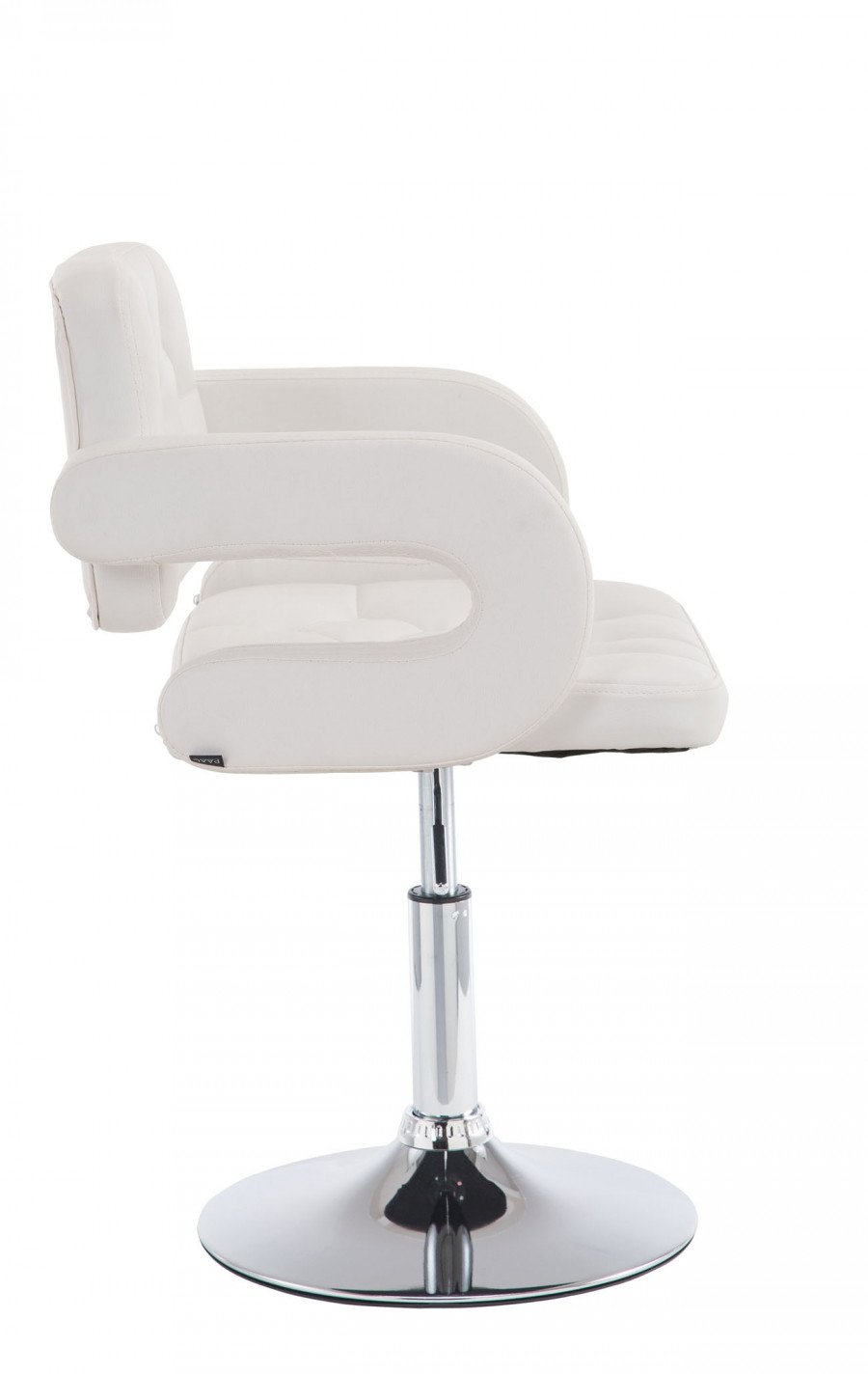 Poltroncina loft con pratici braccioli e seduta regolabile. La sedia design si presenta comodamente imbottita e rivestita in similpelle 100% poliuretano, elastica e facile da pulire. La fodera si presenta trapuntata ad ispirazione capitonn, i bottoni di schienale e seduta sono rivestiti in similpelle, in perfetto stile Chesterfield. Il telaio, con base tonda, realizzato in metallo cromato. Ideale come sedia lounge o per sala attesa, la poltroncina design regolabile in altezza tramite pratica leva.