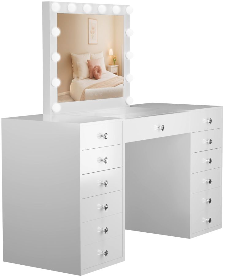Dotato di uno specchio Hollywood circondato da 14 lampadine LED a risparmio energetico, questo tavolo da trucco XXL offre un'illuminazione perfetta. I LED possono essere regolati in tre modalit di luce diverse: bianco caldo, bianco neutro e bianco freddo.