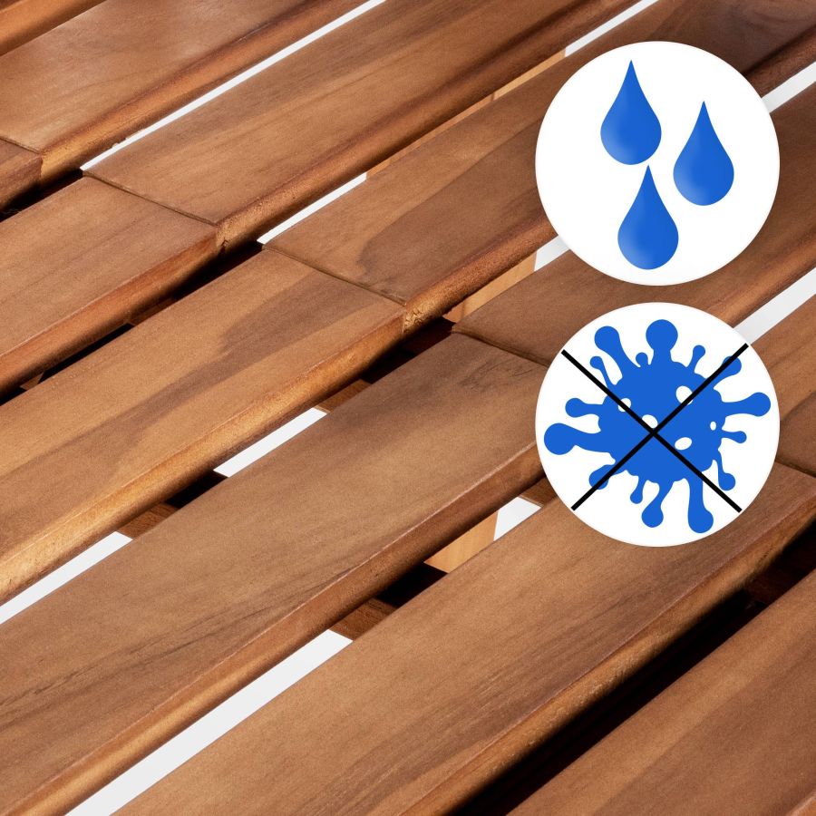 Questo varrebbe poco se i materiali utilizzati non fossero di alta qualit. Tuttavia, il teak utilizzato assolutamente resistente alle intemperie, quindi la panchina pu essere esposta alle intemperie tutto l'anno. Anche il gelo e la neve non danneggiano il legno, mentre il legno massiccio impedisce la formazione di muffe o marciumi. Se non si utilizza l'olio di teak, il legno acquisir solo una patina grigia, che non ne pregiudica la durata e la stabilit. La panca pu sopportare in sicurezza carichi fino a 255 kg.