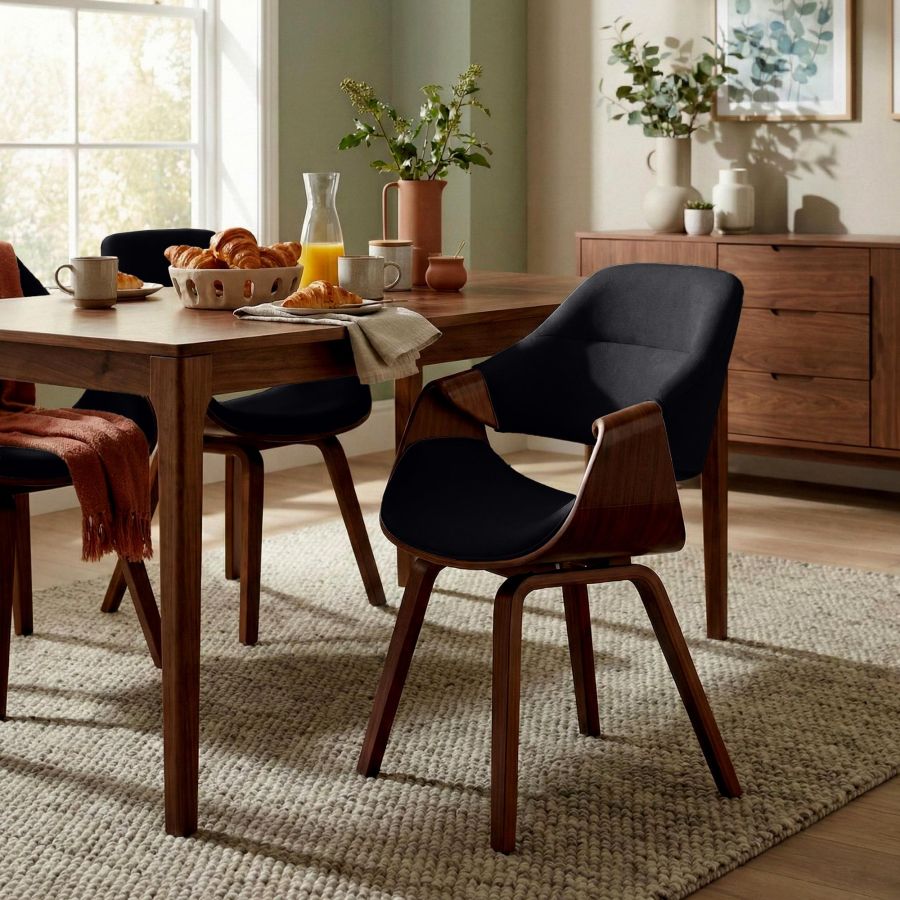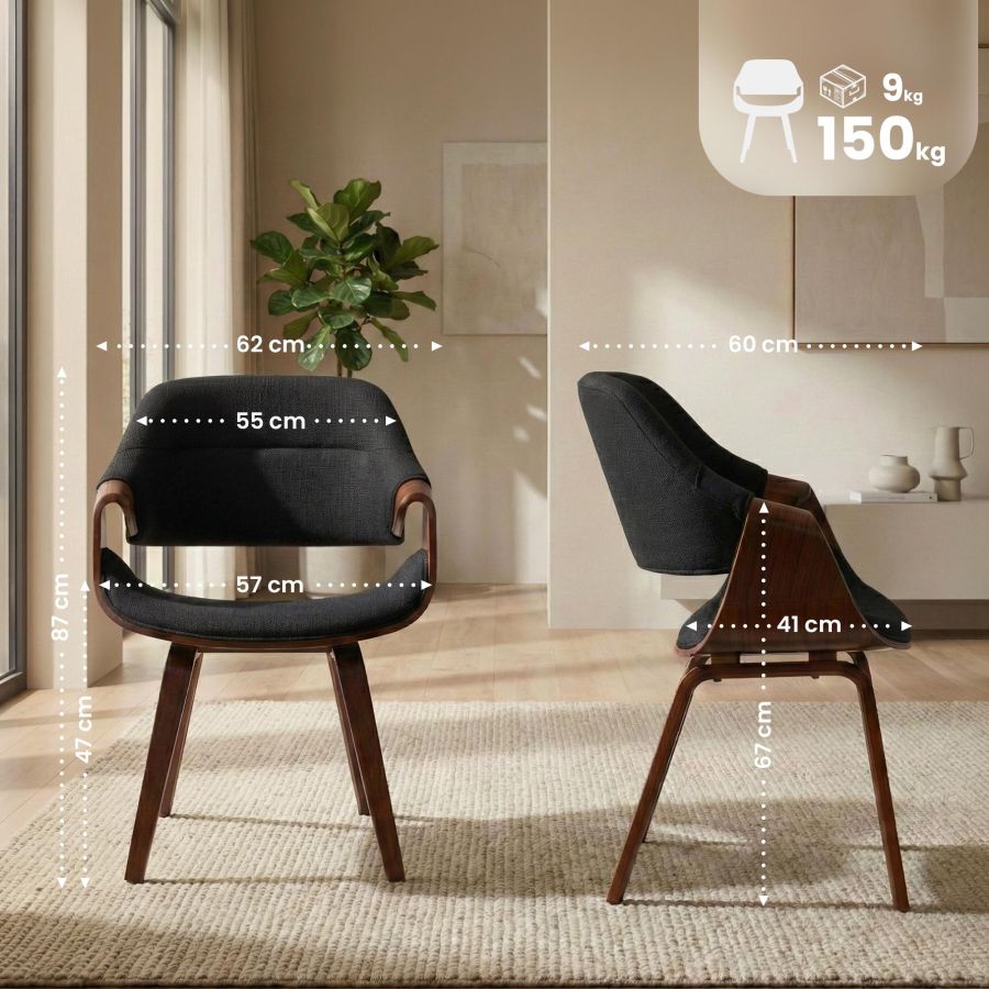 La sedia da pranzo Maira unisce un design Mid-Century senza tempo a un comfort di seduta moderno. Le linee decise della struttura in legno multistrato con elegante finitura effetto noce rendono questa sedia un punto focale in sala da pranzo, cucina o zona lounge. Il progetto curato, con schienale sagomato in modo ergonomico e braccioli integrati, aiuta a mantenere una postura rilassata anche durante l uso prolungato.