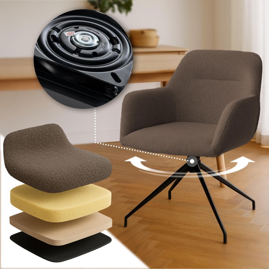 Il comfort garantito da generosi cuscini su seduta, schienale e braccioli, tutti rivestiti in tessuto teddy spesso e caldo. La funzione swivel offre una rotazione di 180 gradi, permettendo un'ampia libert di movimento.