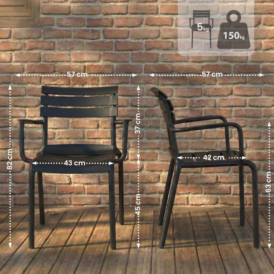 La seduta ergonomica, insieme ai braccioli, offre un comfort piacevole durante una cena all'aperto o nei momenti di relax su balcone e terrazza. Con un'altezza seduta di 45 cm e un'altezza braccioli di 63 cm, si abbina facilmente ai tavoli da pranzo piu comuni.