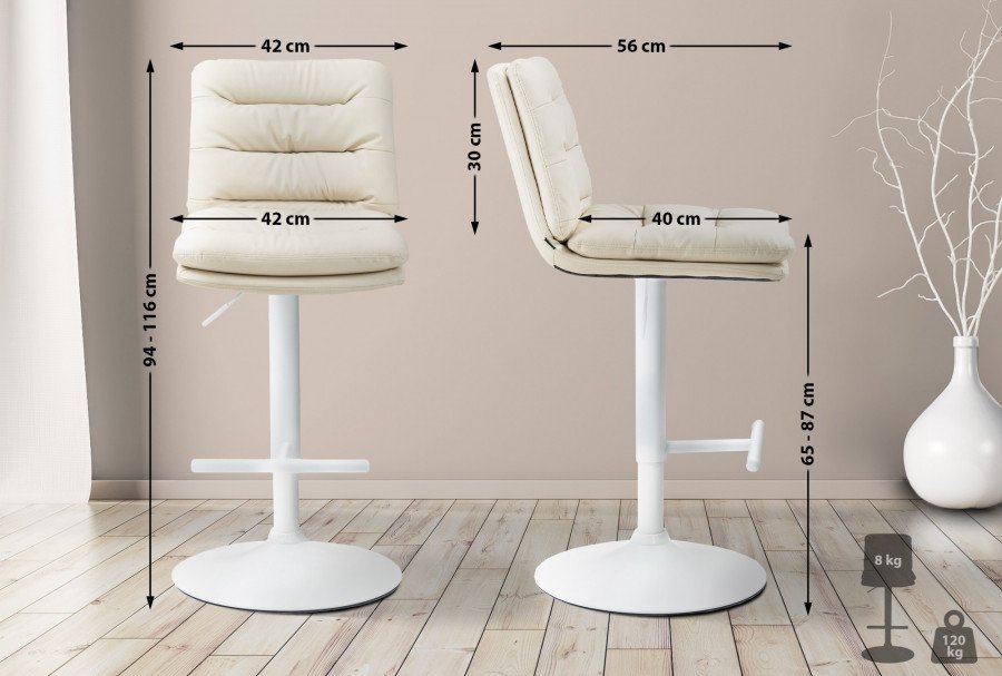 La struttura dello sgabello e il rivestimento alla moda conferiscono allo sgabello un aspetto elegante. Il sedile rivestito in ecopelle di facile manutenzione. La struttura in metallo regolabile in altezza e la funzione girevole a 360 gradi garantisce un'ampia libert di movimento.