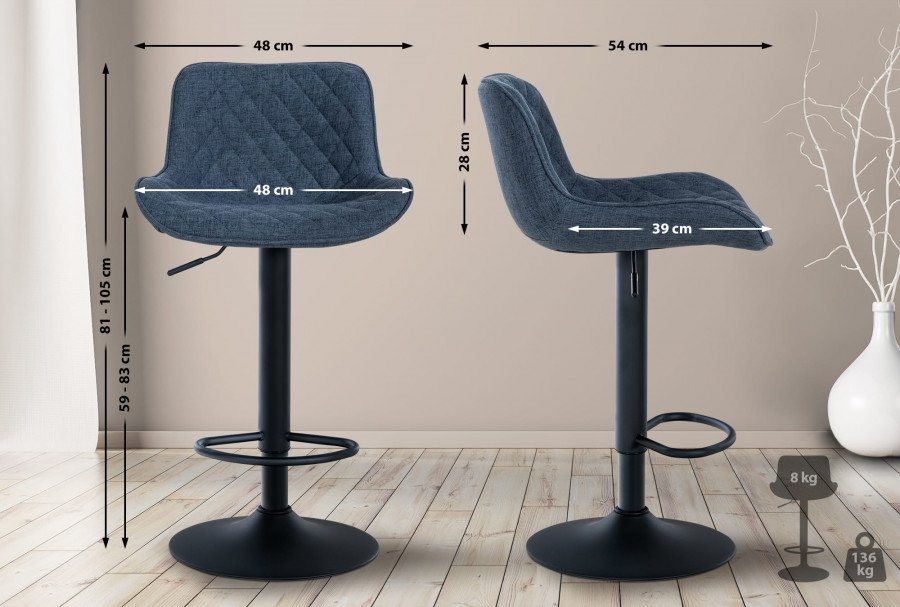 Le cuciture trapuntate sui sedili e sullo schienale conferiscono agli sgabelli una finitura elegante. Il telaio consente una rotazione a 360 gradi e la regolazione dell'altezza, mentre la robusta base a tromba assicura un appoggio sicuro.