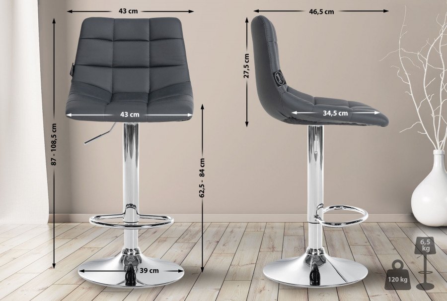 Il rivestimento dello sgabello realizzato in morbida ecopelle e presenta un classico motivo trapuntato. L'aspetto elegante e senza tempo dello sgabello da bar sottolineato dal rivestimento in similpelle in diversi colori. La stabile struttura in metallo dello sgabello disponibile in cromo o nero e garantisce elevata stabilit e durata. Il design minimalista e moderno dello sgabello si adatta perfettamente a qualsiasi interno.