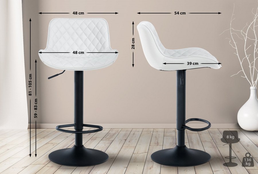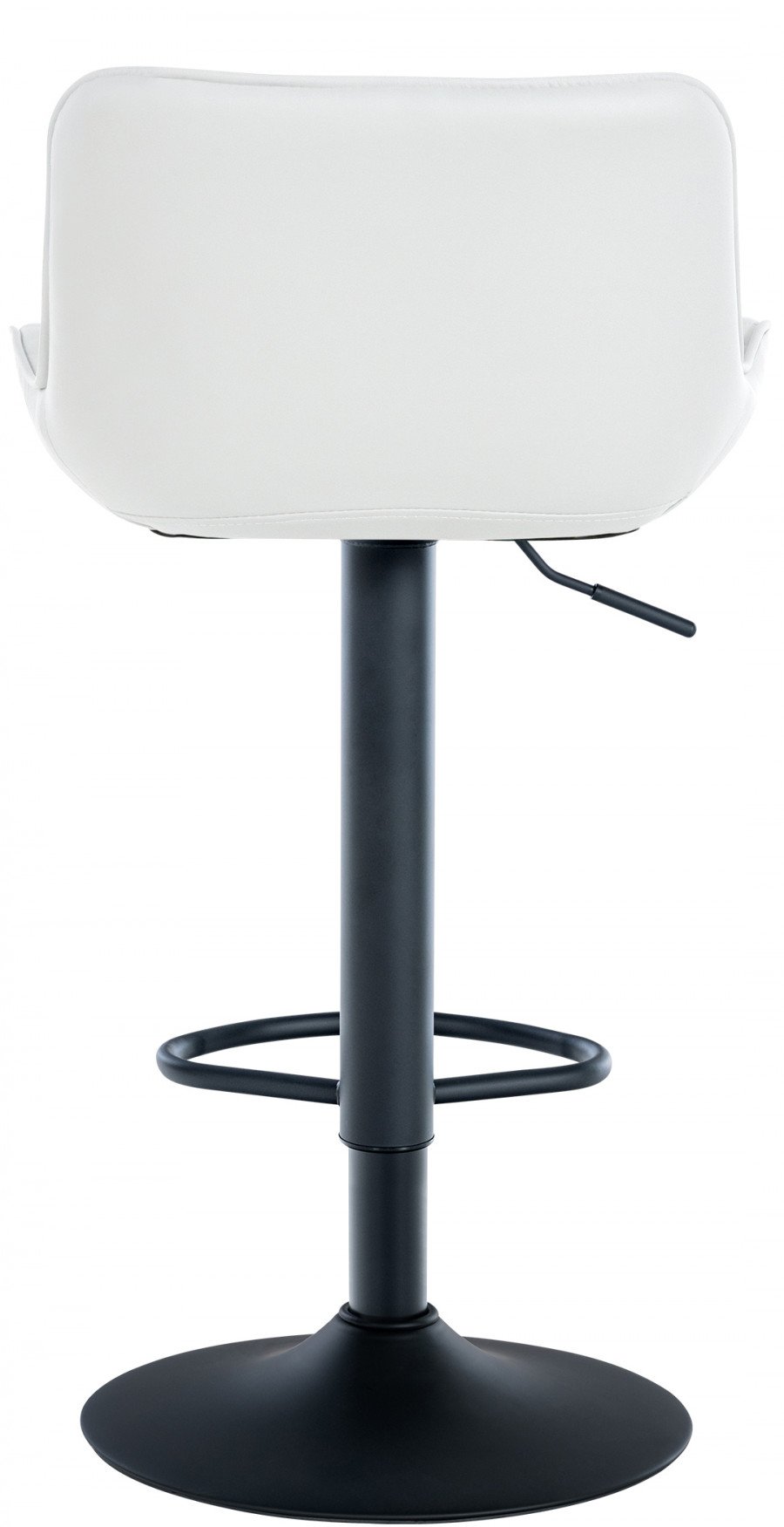 Le cuciture trapuntate sulla seduta e sullo schienale conferiscono allo sgabello una finitura elegante. Il telaio consente la rotazione a 360 gradi e la regolazione dell'altezza, mentre la robusta base a tromba assicura un appoggio sicuro.
