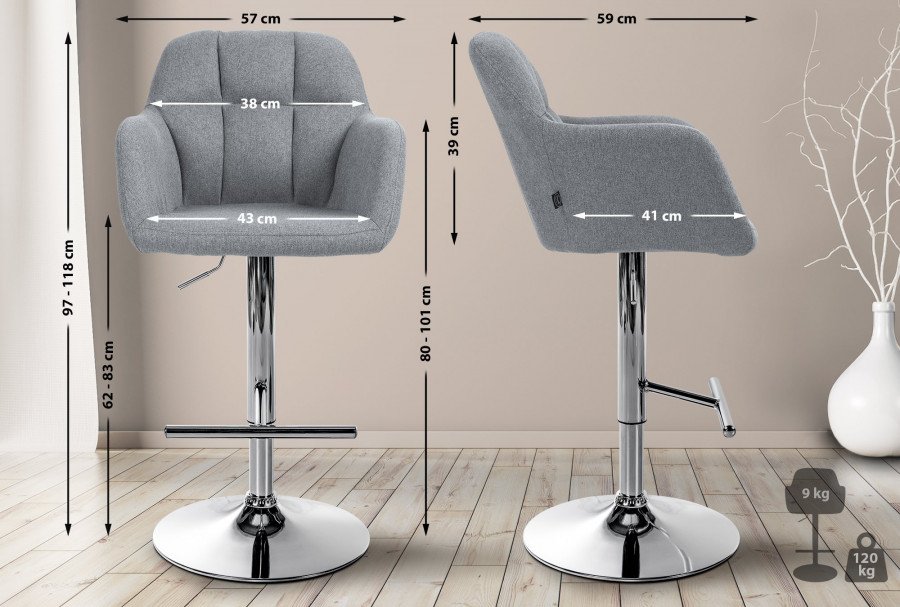 Lo sgabello da bar Natoma in tessuto caratterizzato da un design funzionale e dal comfort di seduta. La regolazione in altezza da 97 a 118 cm, nonch la larghezza di 57 cm e la profondit di 59 cm consentono di adattarlo a un'ampia gamma di altezze di bar. Il sedile e lo schienale di 43 x 41 cm sono progettati per offrire sostegno e comfort. I braccioli e il poggiapiedi sulla base a tromba aggiungono funzionalit, mentre la protezione del pavimento impedisce di danneggiare la superficie. Con un peso di 9 kg e una capacit di carico fino a 120 kg, lo sgabello da bar Natoma una seduta robusta. La funzione girevole a 360 favorisce inoltre la mobilit e la flessibilit.