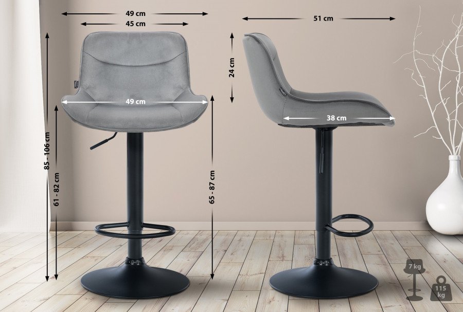 La struttura in metallo e la base a tromba garantiscono stabilit e durata. Il poggiapiedi integrato si regola in base all'altezza del sedile e fornisce un sostegno supplementare. Il rivestimento in velluto conferisce allo sgabello un aspetto elegante e una piacevole esperienza di seduta. Le protezioni per il pavimento proteggono dai graffi.