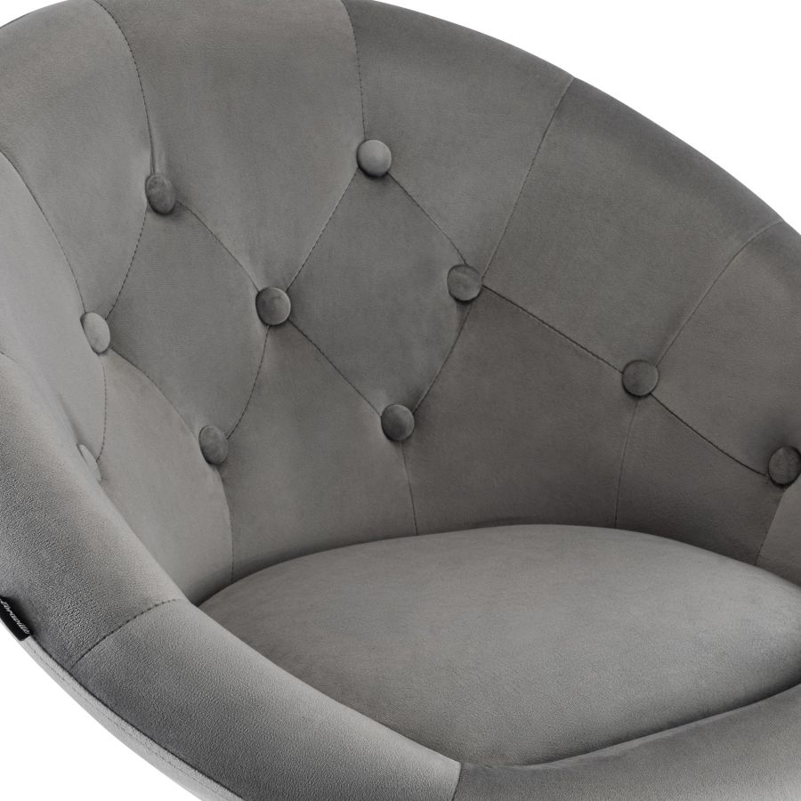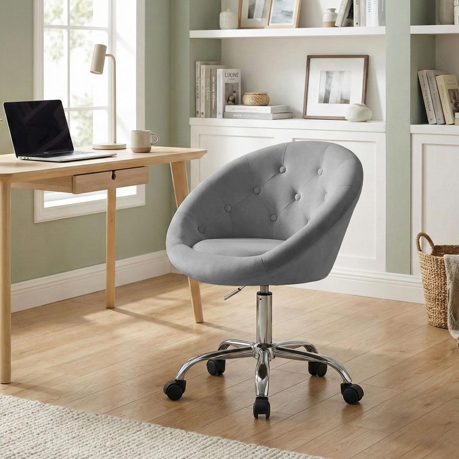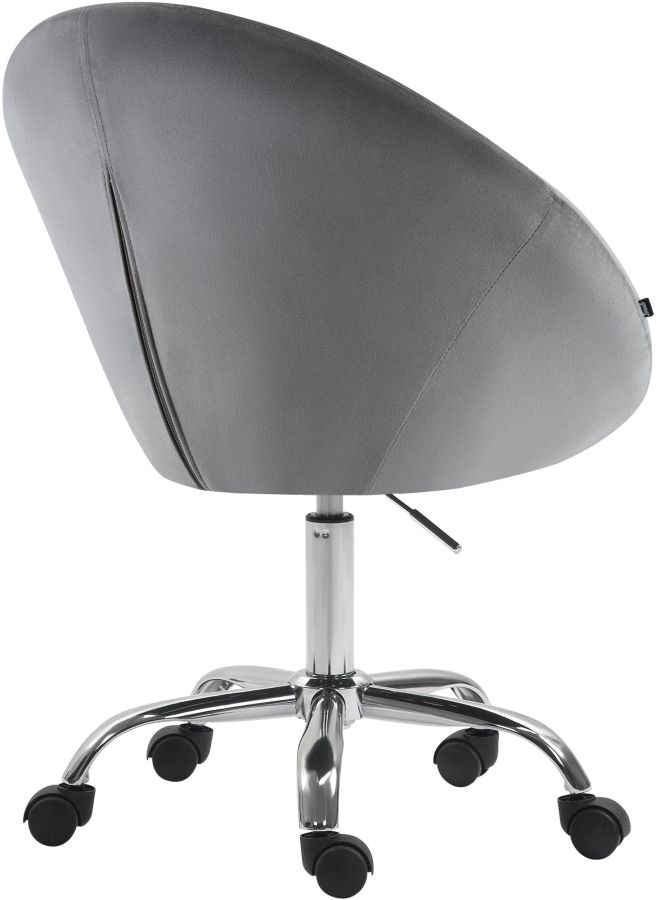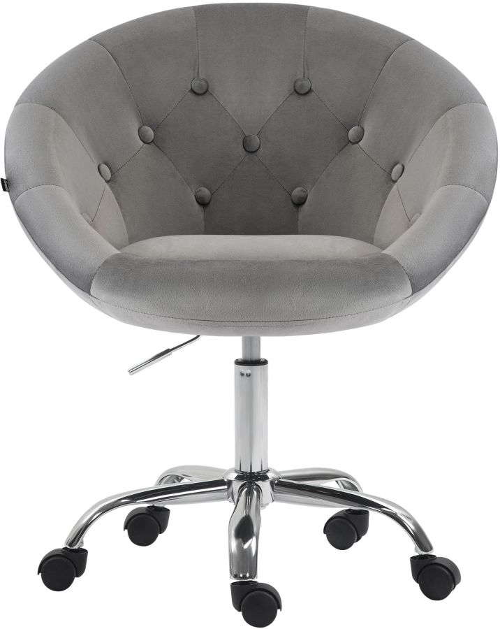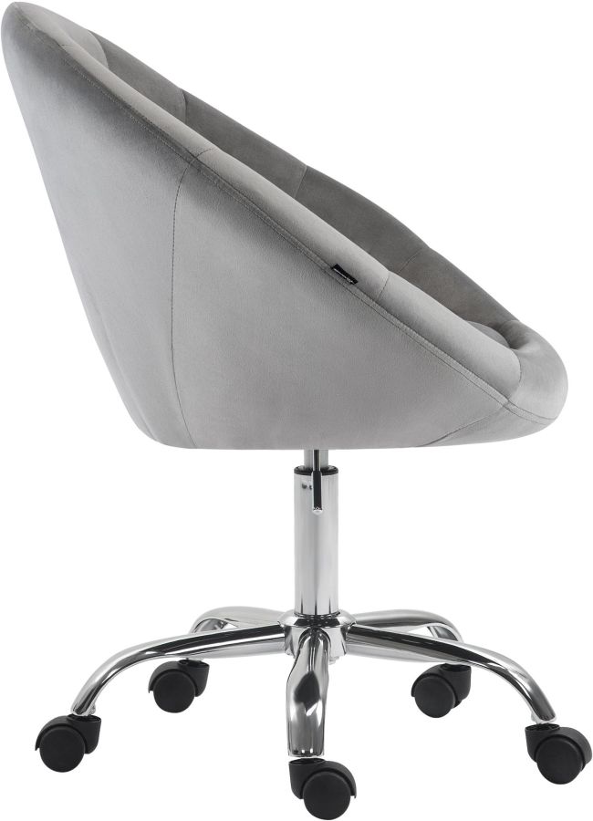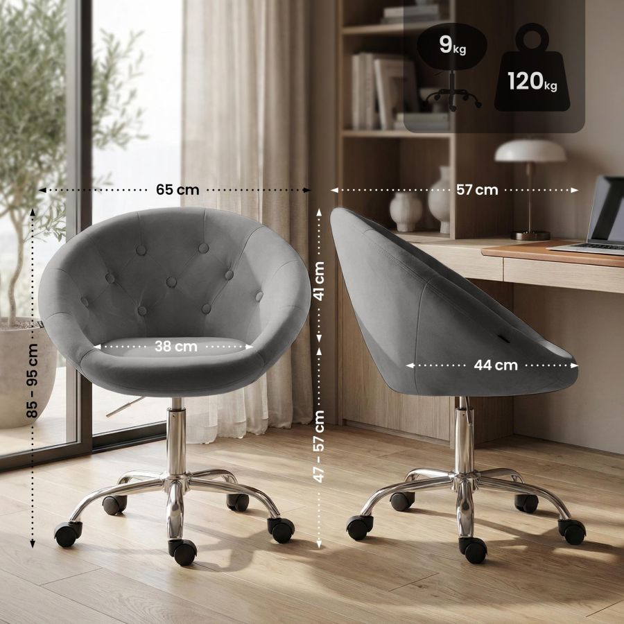 L imbottitura della seduta e rivestita in velluto dal look moderno. Grazie alla base in metallo con finitura cromata e alle cinque ruote scorrevoli, la sedia da lavoro e stabile e allo stesso tempo facile da spostare.